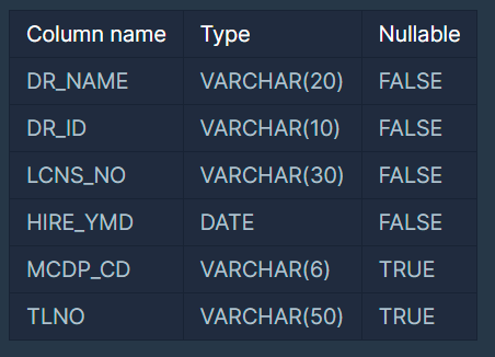 다음은 종합병원에 속한 의사 정보를 담은DOCTOR 테이블입니다. DOCTOR 테이블은 다음과 같으며 DR_NAME, DR_ID, LCNS_NO, HIRE_YMD, MCDP_CD, TLNO는 각각 의사이름, 의사ID, 면허번호, 고용일자, 진료과코드, 전화번호를 나타냅니다.