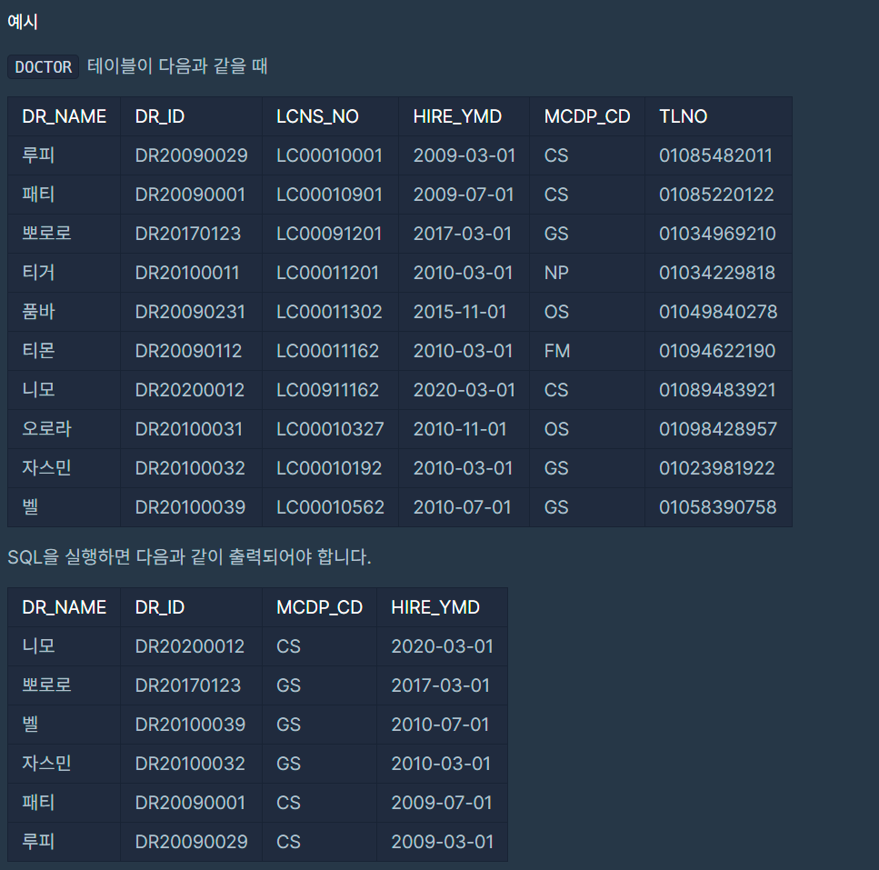 ORDER BY HIRE_YMD DESC, DR_NAME ASC;