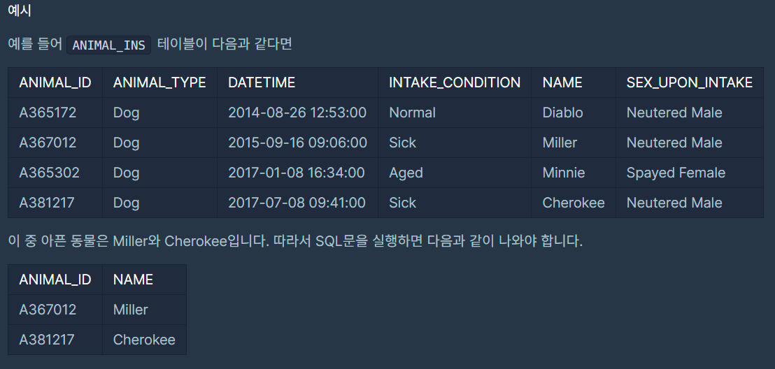 WHERE INTAKE_CONDITION = 'Sick'