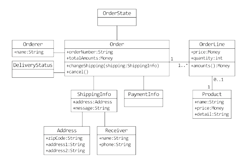 도메인 모델은 특정 도메인을 개념적으로 표현한 것이다. 주문 도메인을 예로 들면, 온라인 쇼핑몰에서 주문을 하기 위해 상품을 선택하고 배송지를 입력한다. 선택한 상품의 가격을 입력하여 계산하고, 결제 수단을 선택해 주문을 완료한다. 만약 배송 전 이라면 배송지 주소를 변경하거나 주문을 취소할 수도 있다. 이를 위한 도메인 모델은 아래와 같다.