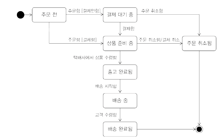 도메인 모델은 꼭 객체로만 모델링하지 않는다. 여러 다이어 그램을 이용하여 모델링도 가능하다. 아래는 주문의 상태 전이를 모델링 한 예시이며 해당 다이어 그램을 통해서 상품 준비 중 상태에서 주문을 취소하면 결제 취소가 함께 이루어 진다는 것을 알 수 있다.
