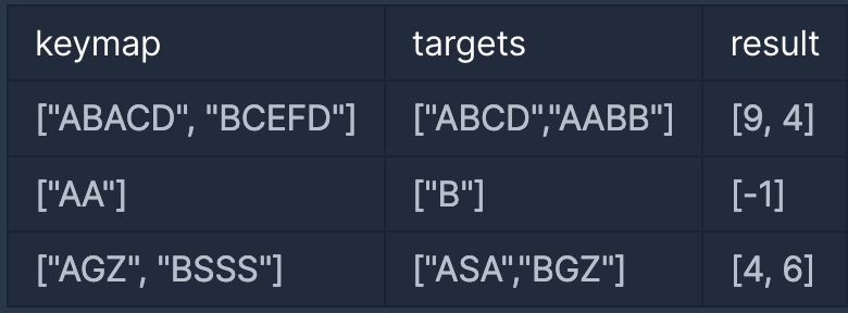 1번 키부터 차례대로 할당된 문자들이 순서대로 담긴 문자열배열 keymap과 입력하려는 문자열들이 담긴 문자열 배열 targets가 주어질 때, 각 문자열을 작성하기 위해 키를 최소 몇 번씩 눌러야 하는지 순서대로 배열에 담아 return 하는 solution 함수를 완성해 주세요.