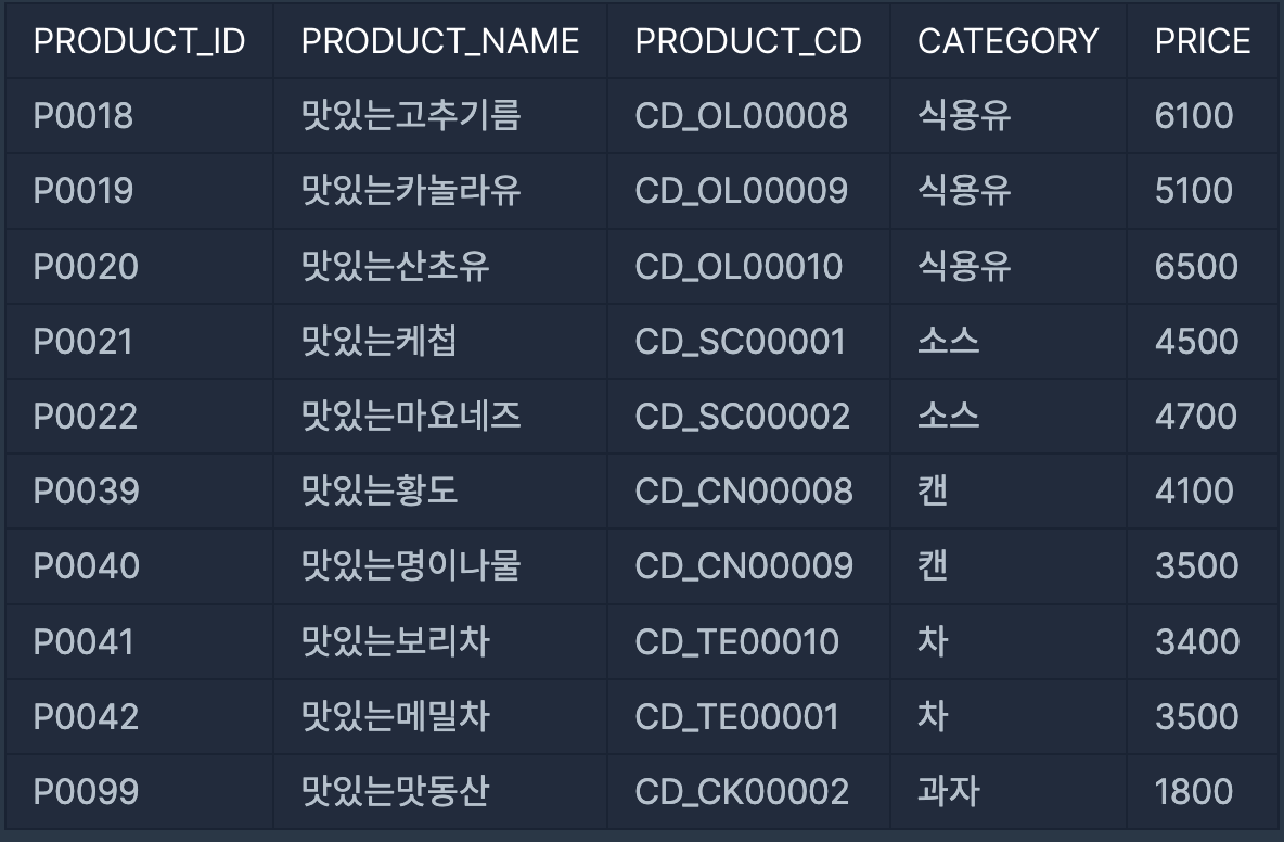 WHERE CATEGORY IN ('과자', '국', '김치', '식용유')