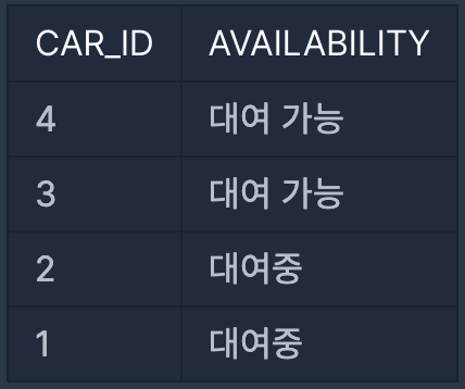 2022년 10월 16일에 대여 중인 자동차는 자동차 ID가 1, 2인 자동차이고, 대여 가능한 자동차는 자동차 ID가 3, 4이므로, '대여중' 또는 '대여 가능' 을 표시하는 컬럼을 추가하고, 자동차 ID를 기준으로 내림차순 정렬하면 다음과 같이 나와야 합니다.