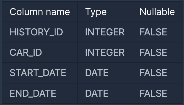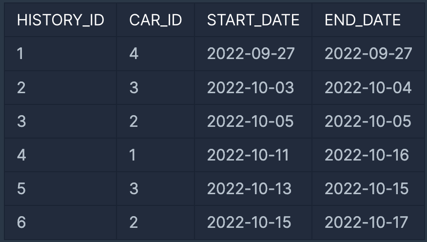 다음은 어느 자동차 대여 회사의 자동차 대여 기록 정보를 담은 CAR_RENTAL_COMPANY_RENTAL_HISTORY 테이블입니다. CAR_RENTAL_COMPANY_RENTAL_HISTORY 테이블은 아래와 같은 구조로 되어있으며, HISTORY_ID, CAR_ID, START_DATE, END_DATE 는 각각 자동차 대여 기록 ID, 자동차 ID, 대여 시작일, 대여 종료일을 나타냅니다.
