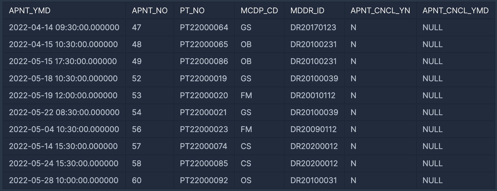 APPOINTMENT 테이블은 다음과 같으며 APNT_YMD, APNT_NO, PT_NO, MCDP_CD, MDDR_ID, APNT_CNCL_YN, APNT_CNCL_YMD는 각각 진료예약일시, 진료예약번호, 환자번호, 진료과코드, 의사ID, 예약취소여부, 예약취소날짜를 나타냅니다.