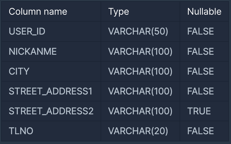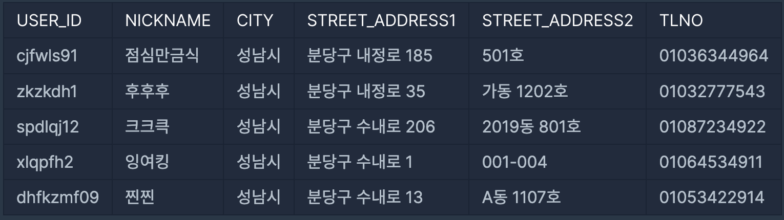 USED_GOODS_USER 테이블은 다음과 같으며 USER_ID, NICKNAME, CITY, STREET_ADDRESS1, STREET_ADDRESS2, TLNO는 각각 회원 ID, 닉네임, 시, 도로명 주소, 상세 주소, 전화번호를 를 의미합니다.