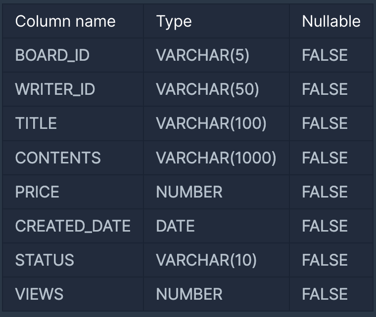 다음은 중고 거래 게시판 정보를 담은 USED_GOODS_BOARD 테이블과 중고 거래 게시판 사용자 정보를 담은 USED_GOODS_USER 테이블입니다. USED_GOODS_BOARD 테이블은 다음과 같으며 BOARD_ID, WRITER_ID, TITLE, CONTENTS, PRICE, CREATED_DATE, STATUS, VIEWS는 게시글 ID, 작성자 ID, 게시글 제목, 게시글 내용, 가격, 작성일, 거래상태, 조회수를 의미합니다.