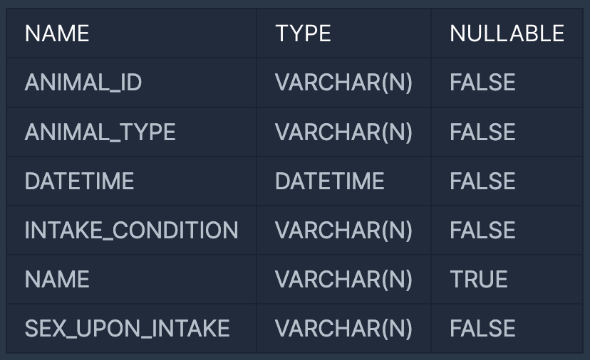 ANIMAL_INS 테이블은 동물 보호소에 들어온 동물의 정보를 담은 테이블입니다. ANIMAL_INS 테이블 구조는 다음과 같으며, ANIMAL_ID, ANIMAL_TYPE, DATETIME, INTAKE_CONDITION, NAME, SEX_UPON_INTAKE는 각각 동물의 아이디, 생물 종, 보호 시작일, 보호 시작 시 상태, 이름, 성별 및 중성화 여부를 나타냅니다.