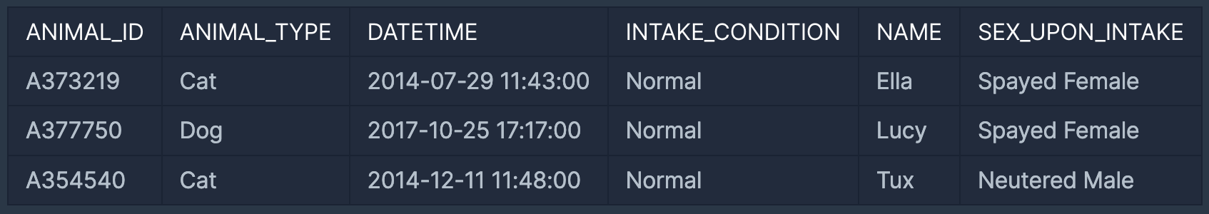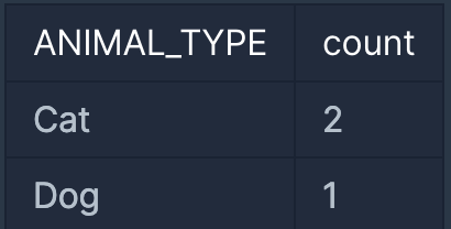 고양이는 2마리, 개는 1마리 들어왔습니다. 따라서 SQL문을 실행하면 다음과 같이 나와야 합니다.