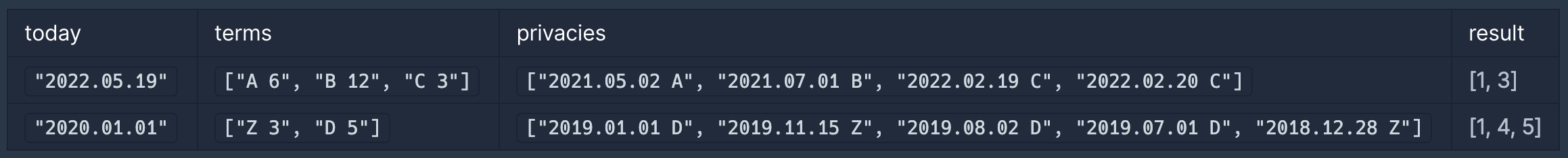 - privacies[i]는 i+1번 개인정보의 수집 일자와 약관 종류를 나타냅니다.