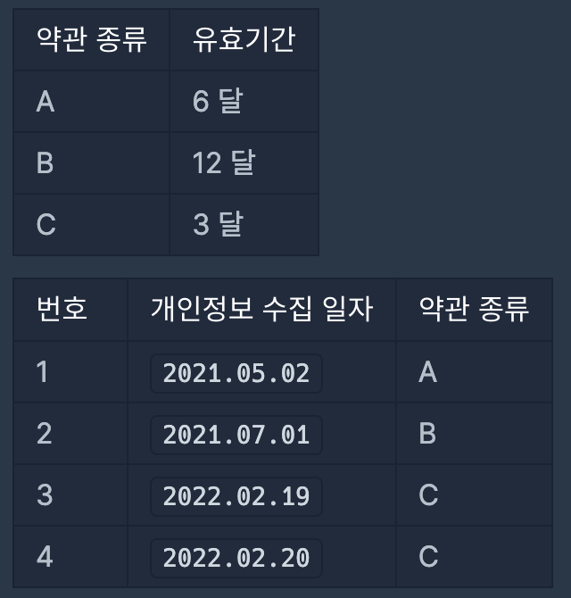 당신은 오늘 날짜로 파기해야 할 개인정보 번호들을 구하려 합니다.
