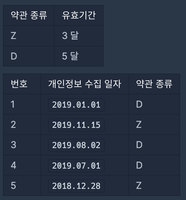- 파기해야 할 개인정보가 하나 이상 존재하는 입력만 주어집니다.