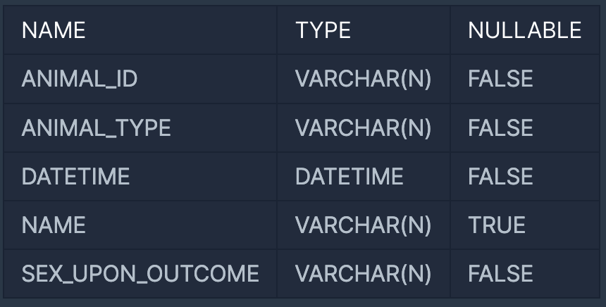 ANIMAL_OUTS 테이블은 동물 보호소에서 입양 보낸 동물의 정보를 담은 테이블입니다. ANIMAL_OUTS 테이블 구조는 다음과 같으며, ANIMAL_ID, ANIMAL_TYPE, DATETIME, NAME, SEX_UPON_OUTCOME는 각각 동물의 아이디, 생물 종, 입양일, 이름, 성별 및 중성화 여부를 나타냅니다.
