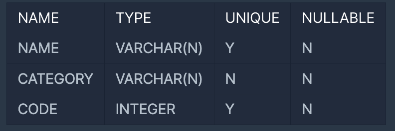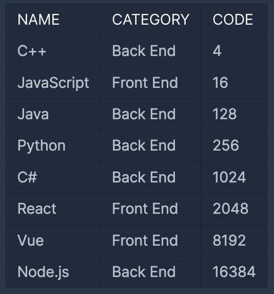 SKILLCODES 테이블은 개발자들이 사용하는 프로그래밍 언어에 대한 정보를 담은 테이블입니다. SKILLCODES 테이블의 구조는 다음과 같으며, NAME, CATEGORY, CODE는 각각 스킬의 이름, 스킬의 범주, 스킬의 코드를 의미합니다. 스킬의 코드는 2진수로 표현했을 때 각 bit로 구분될 수 있도록 2의 제곱수로 구성되어 있습니다.