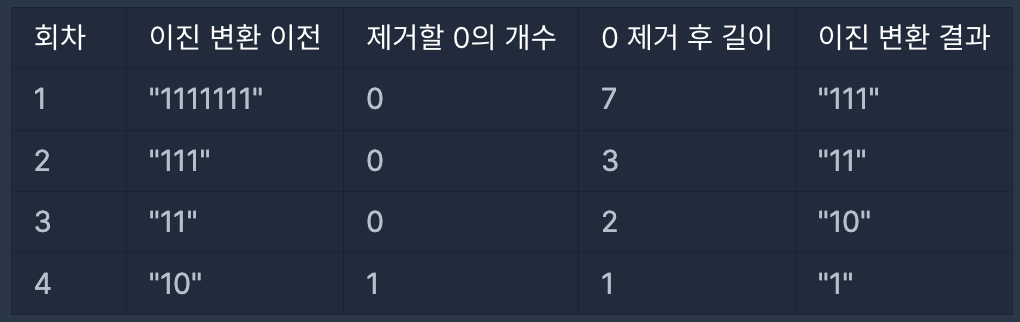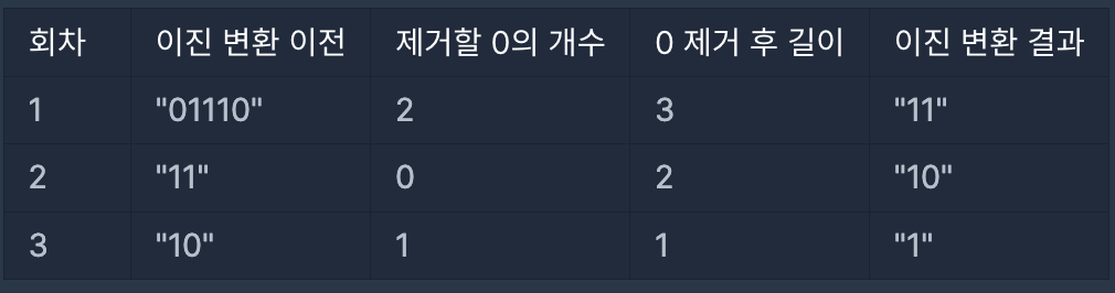 예를 들어, x = "0111010"이라면, x에 이진 변환을 가하면 x = "0111010" -> "1111" -> "100" 이 됩니다.