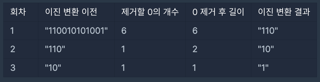 - 3번의 이진 변환을 하는 동안 8개의 0을 제거했으므로, [3,8]을 return 해야 합니다.