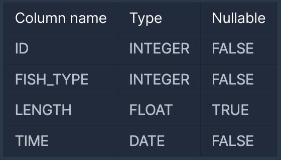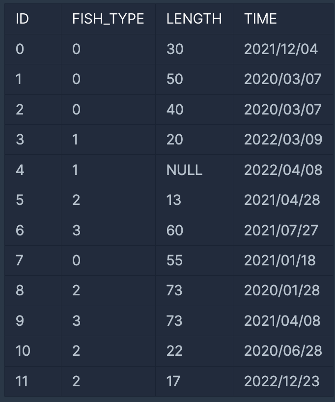낚시앱에서 사용하는 FISH_INFO 테이블은 잡은 물고기들의 정보를 담고 있습니다. FISH_INFO 테이블의 구조는 다음과 같으며 ID, FISH_TYPE, LENGTH, TIME은 각각 잡은 물고기의 ID, 물고기의 종류(숫자), 잡은 물고기의 길이(cm), 물고기를 잡은 날짜를 나타냅니다.