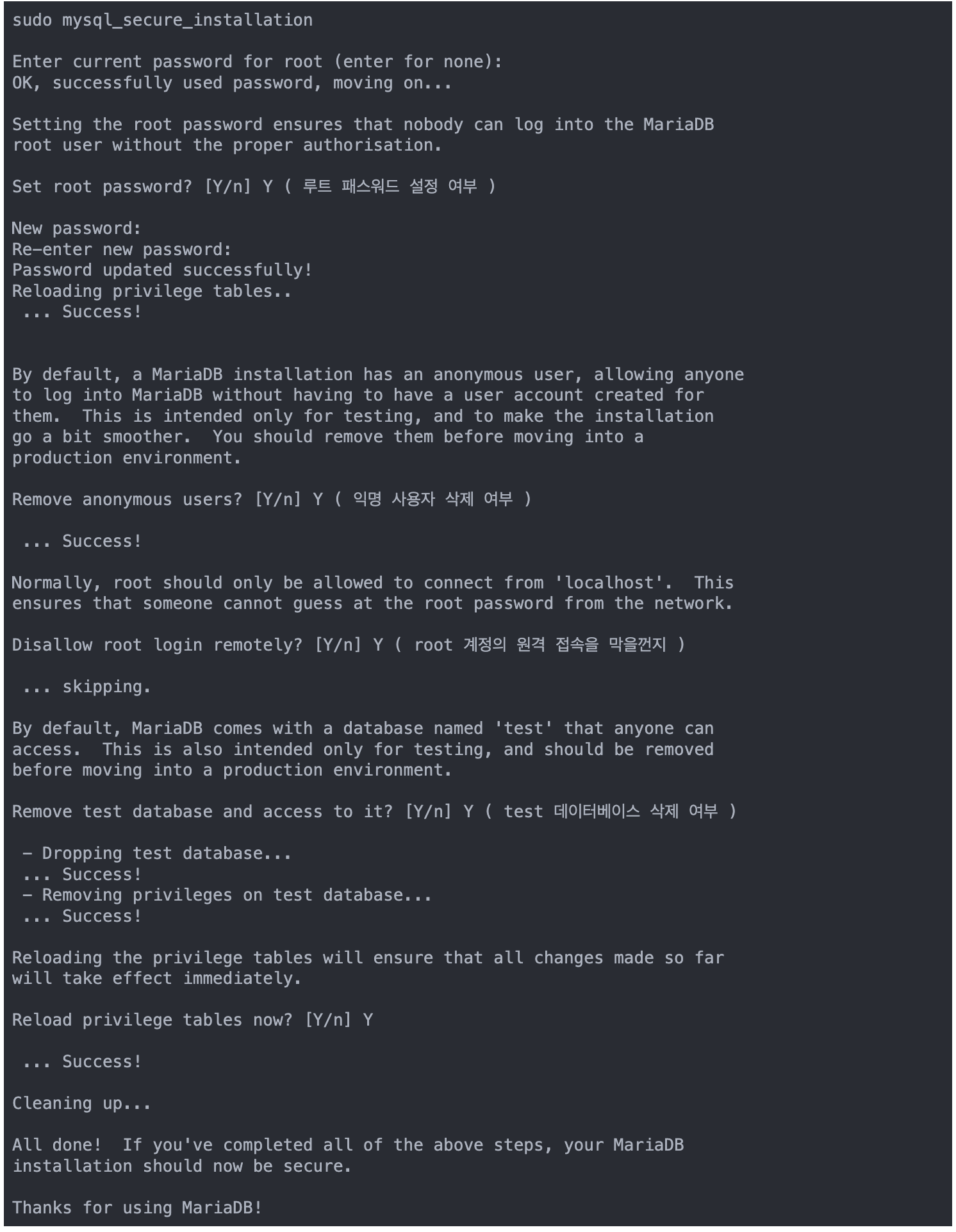 해당 명령어를 입력하면 아래와 같은 설정을 순차적으로 적용시킨다. 만약 root 계정의 패스워드가 설정되지 않았을 경우 설정하는 질문이 먼저 나오는데 알맞게 입력하면 된다.