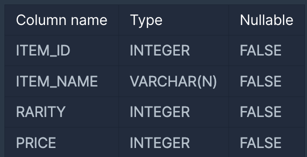 ITEM_INFO 테이블은 다음과 같으며, ITEM_ID, ITEM_NAME, RARITY, PRICE는 각각 아이템 ID, 아이템 명, 아이템의 희귀도, 아이템의 가격을 나타냅니다.