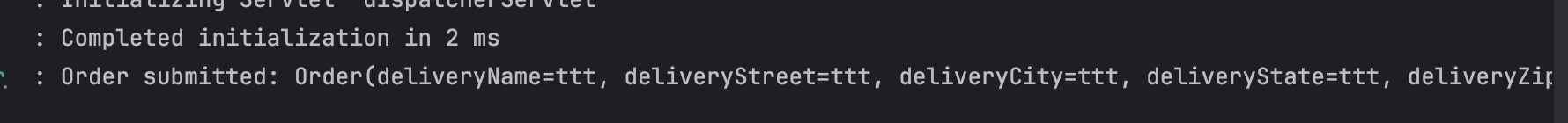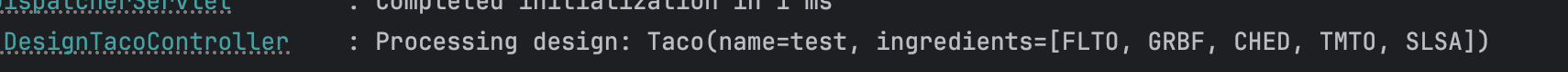 프로젝트를 실행 시키고, 타코 화면이 나오면 폼을 제출한다. 그러면 아래와 같은 출력을 확인할 수 있다.