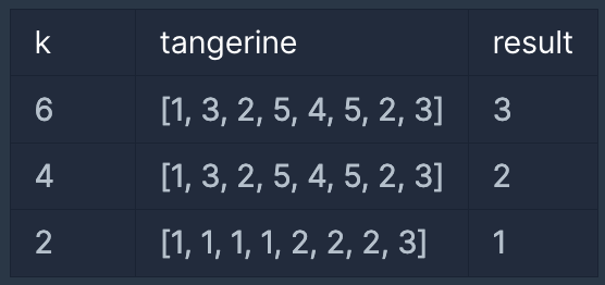 경화가 한 상자에 담으려는 귤의 개수 k와 귤의 크기를 담은 배열 tangerine이 매개변수로 주어집니다. 경화가 귤 k개를 고를 때 크기가 서로 다른 종류의 수의 최솟값을 return 하도록 solution 함수를 작성해주세요.