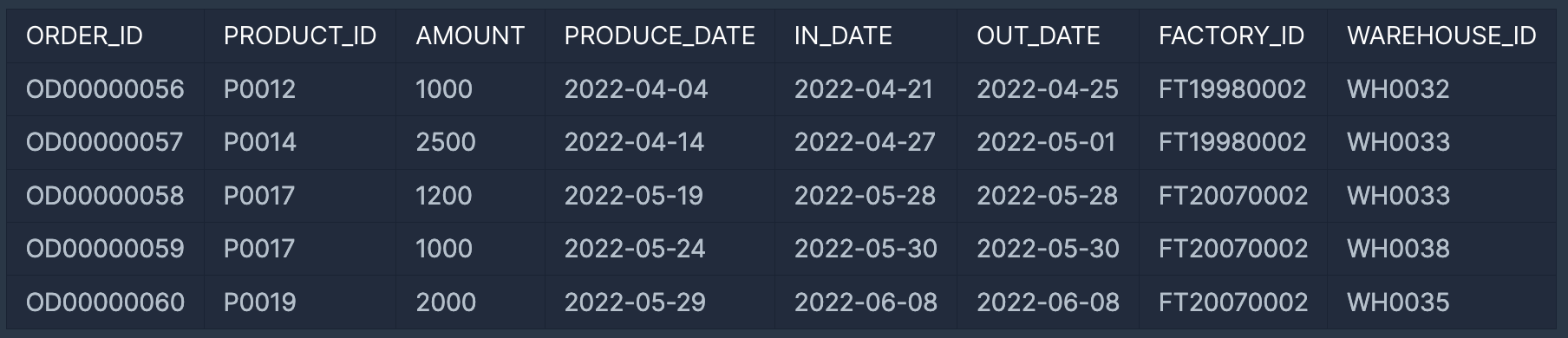 FOOD_ORDER 테이블은 다음과 같으며 ORDER_ID, PRODUCT_ID, AMOUNT, PRODUCE_DATE, IN_DATE, OUT_DATE, FACTORY_ID, WAREHOUSE_ID는 각각 주문 ID, 제품 ID, 주문량, 생산일자, 입고일자, 출고일자, 공장 ID, 창고 ID를 의미합니다.