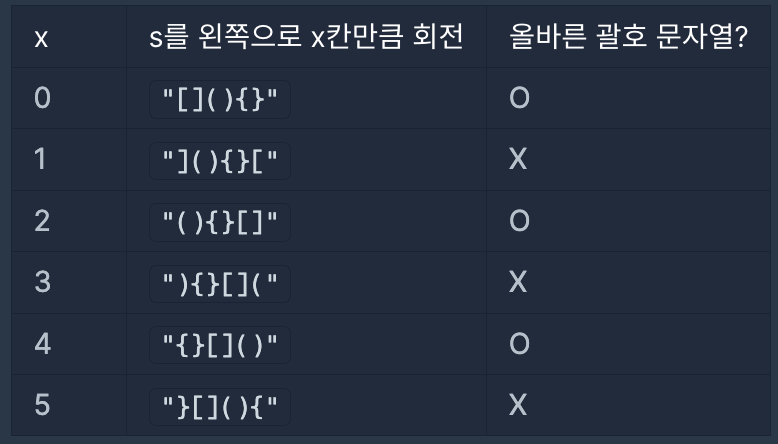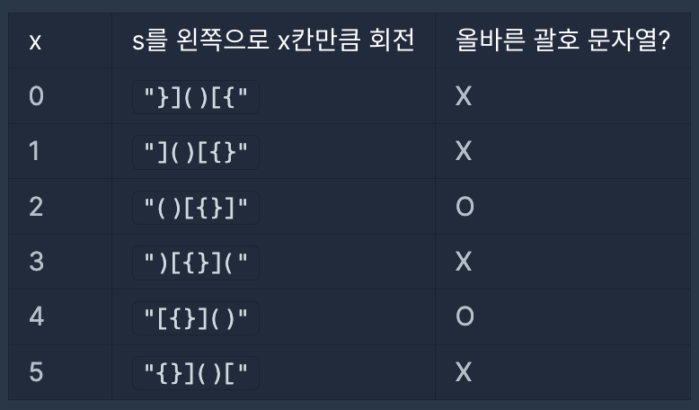 대괄호, 중괄호, 그리고 소괄호로 이루어진 문자열 s가 매개변수로 주어집니다. 이 s를 왼쪽으로 x (0 ≤ x < (s의 길이)) 칸만큼 회전시켰을 때 s가 올바른 괄호 문자열이 되게 하는 x의 개수를 return 하도록 solution 함수를 완성해주세요.