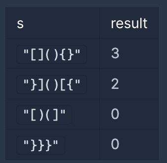 - s를 어떻게 회전하더라도 올바른 괄호 문자열을 만들 수 없으므로, 0을 return 해야 합니다.