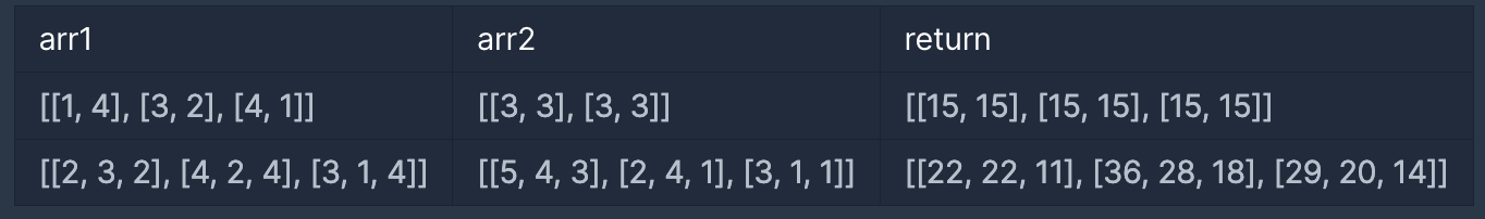 2차원 행렬 arr1과 arr2를 입력받아, arr1에 arr2를 곱한 결과를 반환하는 함수, solution을 완성해주세요.