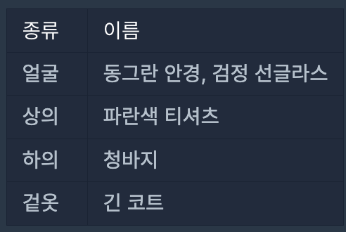 - clothes의 각 행은 [의상의 이름, 의상의 종류]로 이루어져 있습니다.