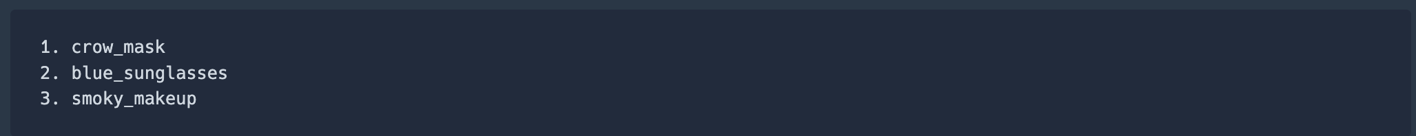 face에 해당하는 의상이 crow_mask, blue_sunglasses, smoky_makeup이므로 아래와 같이 3개의 조합이 가능합니다.