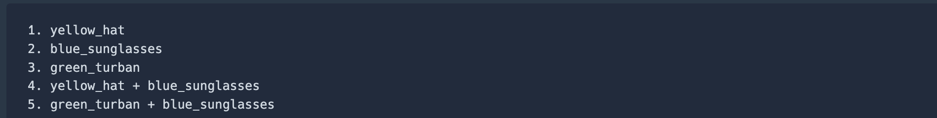 headgear에 해당하는 의상이 yellow_hat, green_turban이고 eyewear에 해당하는 의상이 blue_sunglasses이므로 아래와 같이 5개의 조합이 가능합니다.