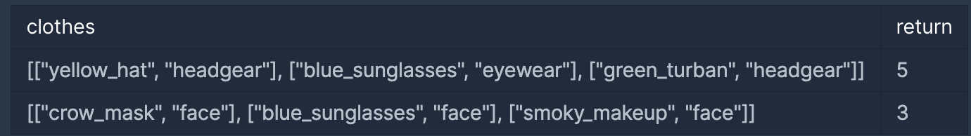 코니가 가진 의상들이 담긴 2차원 배열 clothes가 주어질 때 서로 다른 옷의 조합의 수를 return 하도록 solution 함수를 작성해주세요.