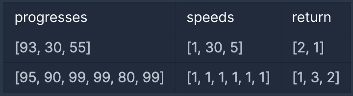 - 작업의 개수(progresses, speeds배열의 길이)는 100개 이하입니다.