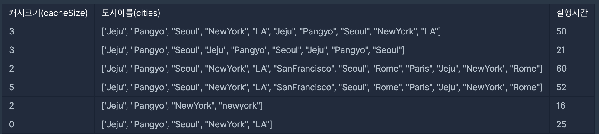 입력 형식을 잘 확인해야 했다. 대소문자를 구분하지 않기 때문에 일정한 형식 (대문자 or 소문자)로 캐시를 구성해야 한다. 그리고 cacheSize의 범위가 0에서 30까지이기 때문에 0일 경우도 처리해야 실패가 되지 않는다.