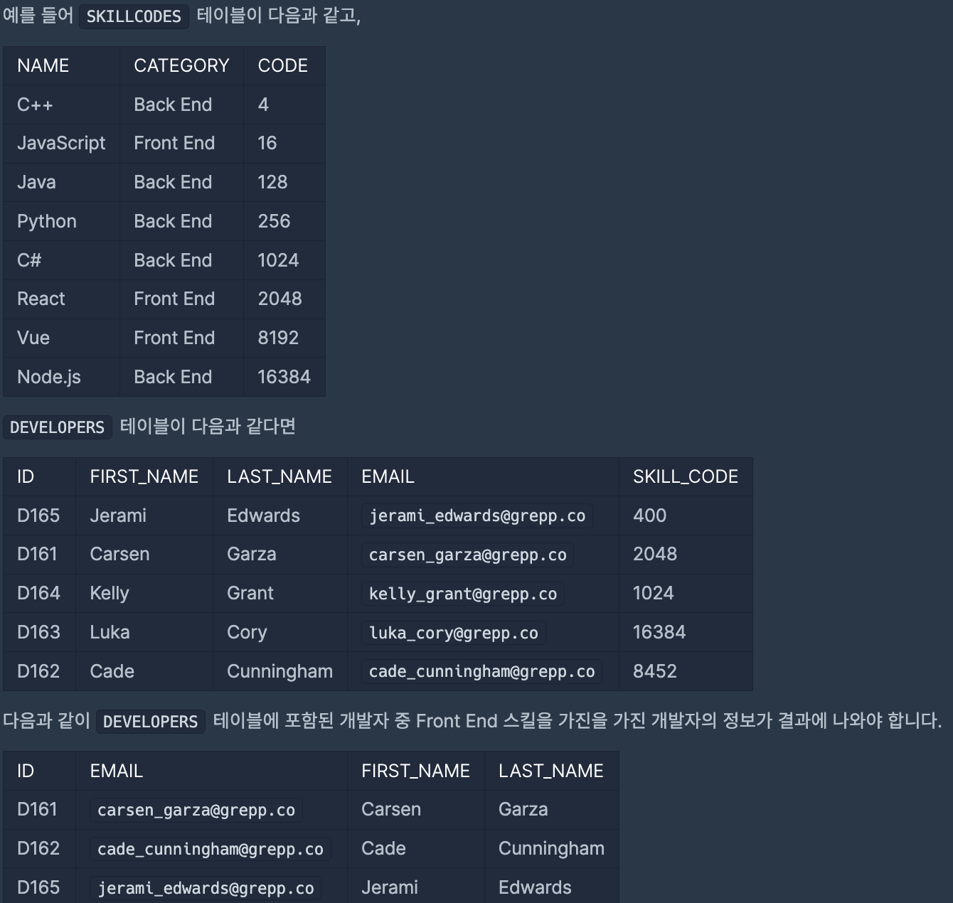 예를 들어 어떤 개발자의 SKILL_CODE가 400 (=b'110010000')이라면, 이는 SKILLCODES 테이블에서 CODE가 256 (=b'100000000'), 128 (=b'10000000'), 16 (=b'10000') 에 해당하는 스킬을 가졌다는 것을 의미합니다.