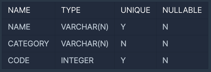 SKILLCODES 테이블은 개발자들이 사용하는 프로그래밍 언어에 대한 정보를 담은 테이블입니다. SKILLCODES 테이블의 구조는 다음과 같으며, NAME, CATEGORY, CODE는 각각 스킬의 이름, 스킬의 범주, 스킬의 코드를 의미합니다. 스킬의 코드는 2진수로 표현했을 때 각 bit로 구분될 수 있도록 2의 제곱수로 구성되어 있습니다.