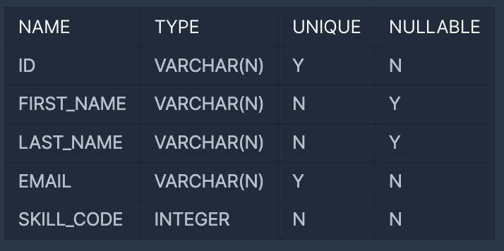 DEVELOPERS 테이블은 개발자들의 프로그래밍 스킬 정보를 담은 테이블입니다. DEVELOPERS 테이블의 구조는 다음과 같으며, ID, FIRST_NAME, LAST_NAME, EMAIL, SKILL_CODE는 각각 개발자의 ID, 이름, 성, 이메일, 스킬 코드를 의미합니다. SKILL_CODE 컬럼은 INTEGER 타입이고, 2진수로 표현했을 때 각 bit는 SKILLCODES 테이블의 코드를 의미합니다.