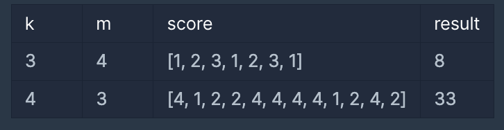 예를 들어, k = 3, m = 4, 사과 7개의 점수가 [1, 2, 3, 1, 2, 3, 1]이라면, 다음과 같이 [2, 3, 2, 3]으로 구성된 사과 상자 1개를 만들어 판매하여 최대 이익을 얻을 수 있습니다.