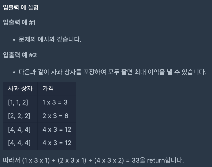 과일 장수가 사과 상자를 포장하고 있습니다. 사과는 상태에 따라 1점부터 k점까지의 점수로 분류하며, k점이 최상품의 사과이고 1점이 최하품의 사과입니다. 사과 한 상자의 가격은 다음과 같이 결정됩니다.