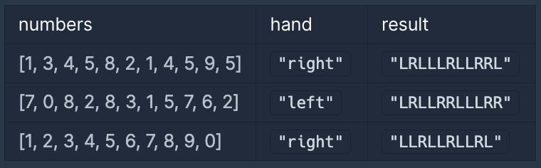- 왼손 엄지손가락을 사용한 경우는 L, 오른손 엄지손가락을 사용한 경우는 R을 순서대로 이어붙여 문자열 형태로 return 해주세요.