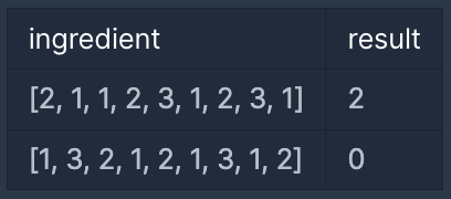 - ingredient의 원소는 1, 2, 3 중 하나의 값이며, 순서대로 빵, 야채, 고기를 의미합니다.