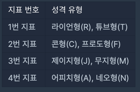 4개의 지표가 있으므로 성격 유형은 총 16(=2 x 2 x 2 x 2)가지가 나올 수 있습니다. 예를 들어, "RFMN"이나 "TCMA"와 같은 성격 유형이 있습니다.