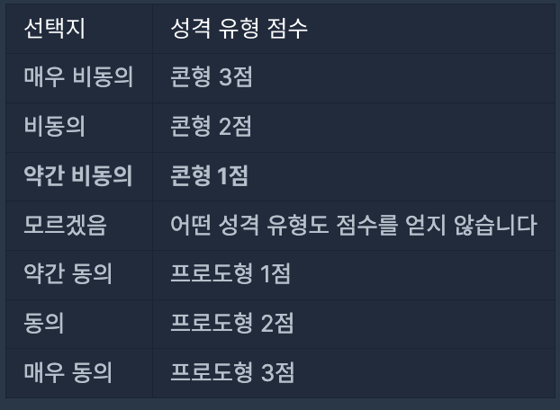 2번 질문에서 검사자는 약간 비동의 선택지를 선택했으므로 콘형(C) 성격 유형 점수 1점을 얻게 됩니다.