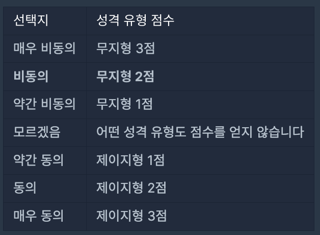 각 질문은 1가지 지표로 성격 유형 점수를 판단합니다.