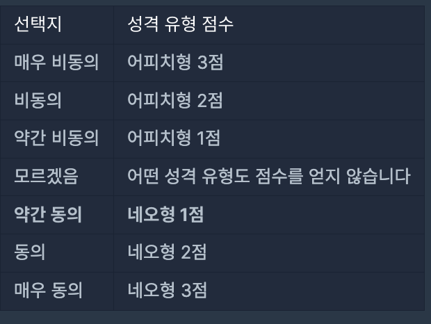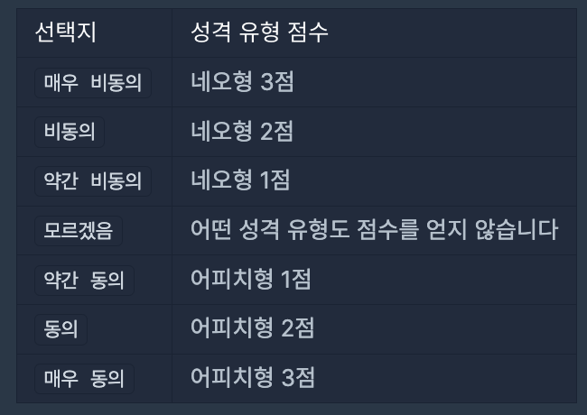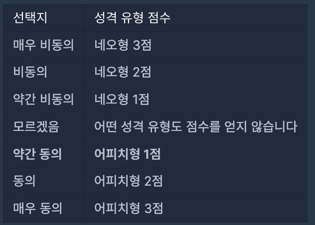 이때 검사자가 질문에서 약간 동의 선택지를 선택할 경우 어피치형(A) 성격 유형 1점을 받게 됩니다. 만약 검사자가 매우 비동의 선택지를 선택할 경우 네오형(N) 성격 유형 3점을 받게 됩니다.
