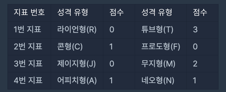 검사 결과는 모든 질문의 성격 유형 점수를 더하여 각 지표에서 더 높은 점수를 받은 성격 유형이 검사자의 성격 유형이라고 판단합니다. 단, 하나의 지표에서 각 성격 유형 점수가 같으면, 두 성격 유형 중 사전 순으로 빠른 성격 유형을 검사자의 성격 유형이라고 판단합니다.
