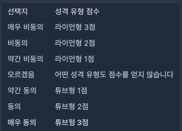 4번 질문에서 검사자는 매우 동의 선택지를 선택했으므로 튜브형(T) 성격 유형 점수 3점을 얻게 됩니다.