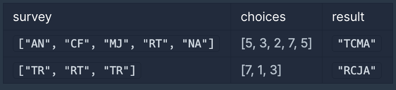 - survey의 원소는 "RT", "TR", "FC", "CF", "MJ", "JM", "AN", "NA" 중 하나입니다.